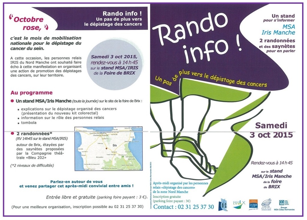 Dans le cadre de notre partenariat avec l'IRIS MANCHE et notre labellisation "SPORT APRES CANCER", nous participerons à la RANDO INFO organisée par la MSA et IRIS MANCHE sur la foire de BRIX.