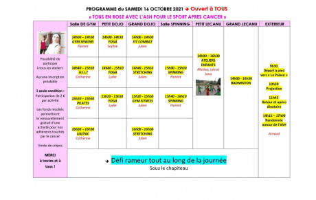 Dans le cadre de notre journée "Tous en Rose avec l'ASH pour le sport Après Cancer", le programme que nous proposons est maintenant disponible. N'oubliez pas votre tee-shirt Rose Attention : pass sanitaire obligatoire
